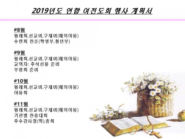 ilsim Contents 일심나눔터 공지사항 경조부 게시판 행사갤러리 새가족소개 섬김부서 유아부 유치부 유년부 초등부 학생부 청년부 남전도회 여전도회 예배설교 목사님설교 초청강사설교 특별영상 찬양 교회소개 교회비전 예배안내 섬기는이들 교회발자취 오시는길 여전도회 여전도회 > 섬김부서 > Home 여전도회 2019년 연합여전도회 행사계획서 및 임원구성 페이지 정보 작성자 관리자 작성일19-07-22 23:33 조회5,989회 댓글0건 다음글 목록 본문 2019년 연합여전도회 행사계획서 및 임원구성 댓글목록 등록된 댓글이 없습니다. 다음글 목록